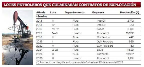 Existen siete lotes cuyos contratos de concesión expiran entre el 2013 y el 2016 y que deberán revertir al Estado Peruano. En Talara, los lotes III y IV en manos de la empresa noruega Interoil y en la selva norte, el lote 1AB que explota Pluspetrol Norte, deberían ser exclusivamente explotados por Petroperú. La producción de estos tres lotes no supera los 20000 barriles diarios.