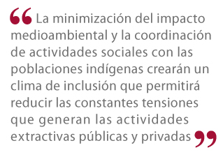 La minimización del impacto medioambiental y la coordinación de actividades sociales con las poblaciones indígenas crearán un clima de inclusión que permitirá reducir las constantes tensiones que generan las actividades extractivas públicas y privadas.