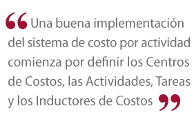 Una buena implementación del sistema de costo por actividad comienza por definir los Centros de Costos, las Actividades, Tareas y los Inductores de Costos.