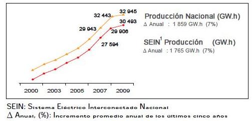 En relación al consumo energético, el Ministerio de Energía y Minas, en su informe anual "Perú: Sector Eléctrico 2010", informó que en el quinquenio de 2004 - 2009 la producción de energía eléctrica a nivel nacional y en el SEIN experimentó un crecimiento del 7% de promedio anual, es decir, aproximadamente 1800 GWh/anuales, figura 2.