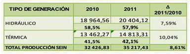 En el informe "Resumen Estadístico Anual del SEIN 2011" del COES, se observa que la producción anual de energía eléctrica en el 2011 totalizó 35217,43 GWh, la que representó un incremento del 8,61% superior al registrado en el 2010, que fue de 32426,83 GWh. En la tabla 1, se presenta la producción eléctrica en el SEIN en el 2010 y 2011.