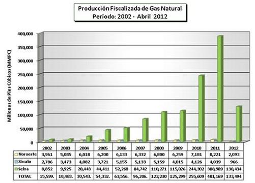En la figura 3, se observa la evolución de la producción de gas natural desde el 2002 hasta abril del 2012, según Perú-Petro, Agencia Nacional de Hidrocarburos. La producción de gas natural en el 2011 alcanzó los 401,169 millones de pies cúbicos que equivalen a 0,401 billones de pies cúbicos (0,4 TCF en inglés).