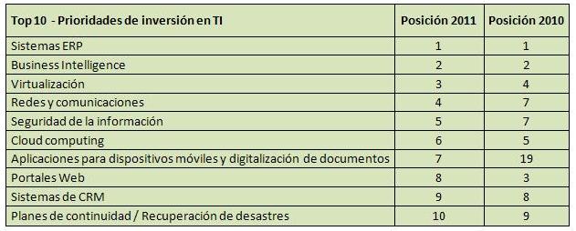 Completan este ranking de "top 10" prioridades de inversión en TI cloud computing (No. 6); aplicaciones para dispositivos móviles y digitalización de documentos (No. 7); portales Web (No. 8); sistemas de CRM (No. 9); y finalmente planes de continuidad/recuperación de desastres (No. 10).