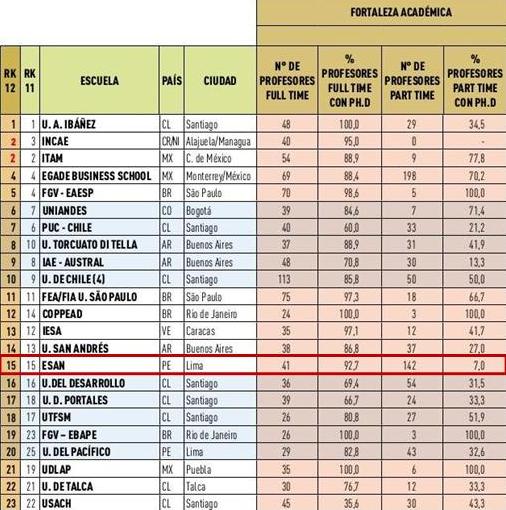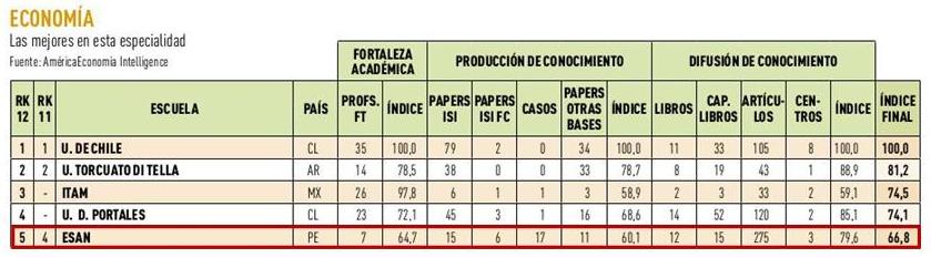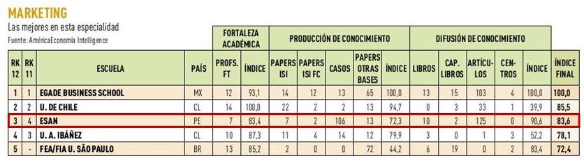ESAN ha sido considerada nuevamente como la primera escuela de negocios en el Perú según el ranking MBA 2012 de América Economía. Destacan las especialidades de Marketing y Economía por su fortaleza académica, producción y difusión del conocimiento. En Internacionalización, resalta por la calidad de sus convenios de intercambio de alumnos con reconocidas universidades de todo el mundo.