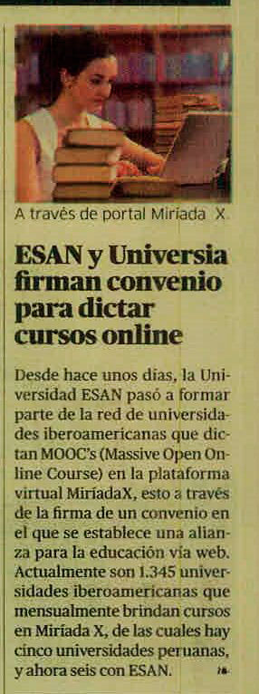 Desde hace unos días, la Universidad ESAN pasó a formar parte de la red de universidades iberoamericanas que dictan MOOC´s (Massive Open Online Course) en la plataforma virtual Miríada X, esto a través de la firma de un convenio en el que se establece una alianza para la educación vía web.