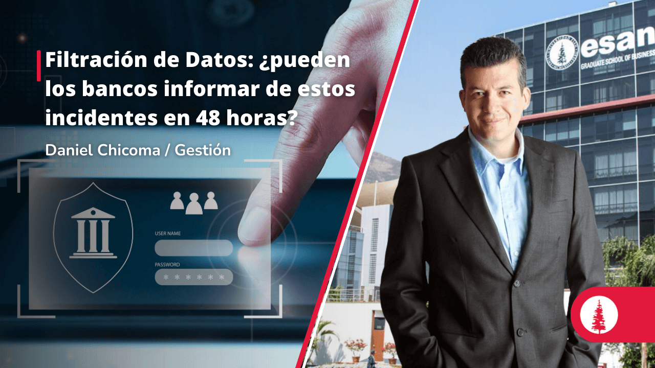 Daniel Chicoma, docente de los programas del área de Marketing y Dirección Comercial de ESAN, opinó en Gestión sobre la viabilidad de que los bancos reporten incidentes de seguridad de datos personales a terceros en un máximo de 48 horas. Concluyó que esto es factible, ya que los bancos ya utilizan sistemas en tiempo real para las operaciones de las cuentas.