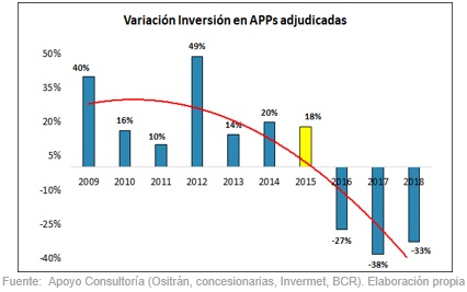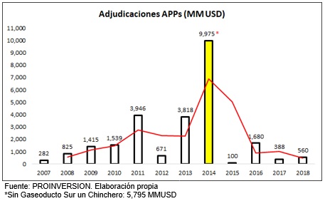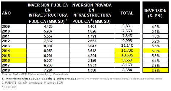 Un estudio del Banco Mundial revela que, por cada 1 % de crecimiento del PBI, los países latinoamericanos requieren invertir un promedio de 1 % en infraestructura pública. En ese sentido, para crecer un 6 %, porcentaje estimado para salir del estancamiento de la renta media , habría que adjudicar e invertir cerca de 6 % del PBI por año, es decir, USD 14 000 millones, cifra que casi duplica lo registrado últimamente en el Perú, según se muestra en el siguiente cuadro: