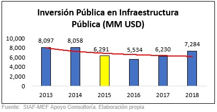 Respecto a la inversión con recursos públicos en infraestructura, los siguientes cuadros muestran también una caída entre el 2014 y 2018, del 11 %.
