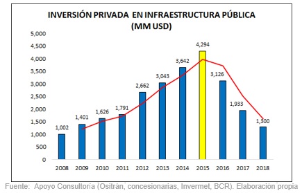 Según el Instituto Peruano de Economía (IPE), las actividades de inversión y operación en infraestructura de empresas, vinculadas a la Asociación para el Fomento de la Infraestructura Nacional (AFIN), que agrupa a las principales empresas concesionarias de infraestructura de servicios públicos, aportaron el 9.8 % del PBI generado entre 2007 y 2012, así como el 6.2 % de empleo y el 20.8 % de impuestos recaudados. Aun así, pocos se percatan de la inversión privada y que ésta debería crecer a un ritmo comparable al del PBI para soportar el crecimiento de manera sostenible.