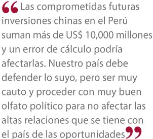 "Las comprometidas futuras inversiones chinas en el Perú suman más de US$ 10,000 millones y un error de cálculo podría afectarlas. Nuestro país debe defender lo suyo, pero ser muy cauto y proceder con muy buen olfato político para no afectar las altas relaciones que se tiene con el país de las oportunidades", concluyó.