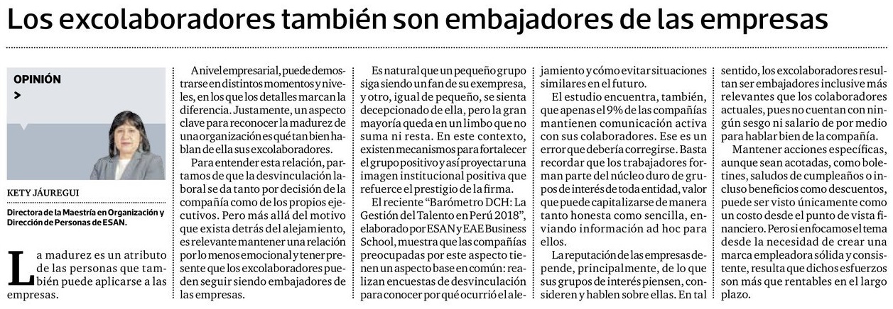 La reputación de las empresas depende, principalmente, de lo que sus grupos de interés piensen, consideren y hablen sobre ellas. En tal sentido, los excolaboradores resultan ser embajadores inclusive más relevantes que los colaboradores actuales, pues no cuentan con ningún sesgo ni salario de por medio para hablar bien de la compañía.