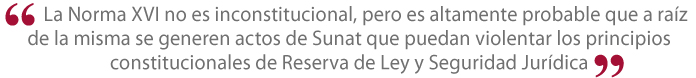 La Norma XVI no es inconstitucional, pero es altamente probable que a raíz de la misma se generen actos de Sunat que puedan violentar los principios constitucionales de Reserva de Ley y Seguridad Jurídica.