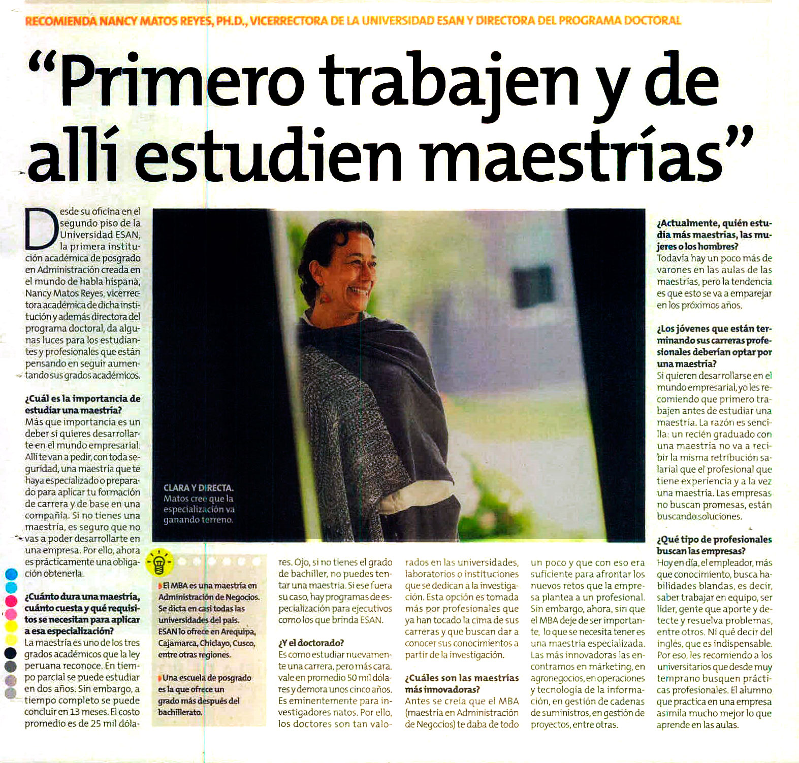 "Si quieren desarrollarse en el mundo empresarial, yo les recomiendo que primero trabajen antes de estudiar una maestría. La razón es sencilla: un recién graduado con una maestría no va a recibir la misma retribución salarial que el profesional que tiene experiencia y a la vez una maestría. Las empresas no buscan promesas, buscan soluciones", dijo Nancy Matos Reyes, Ph.D., vicerrectora de la Universidad ESAN y Directora del Programa Doctoral.