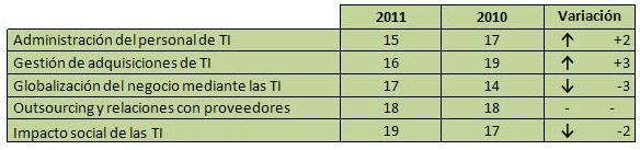 La gestión de adquisiciones de TI ascendió tres posiciones, lo cual indica que se estaría dando mayor importancia a las decisiones sobre inversiones en TI, ya que éstas representan montos cada vez más considerables. La globalización del negocio mediante las TI desciende tres posiciones en el ranking hasta ubicarse en el puesto 17, probablemente en el 2011 las organizaciones priorizaron las TI a nivel doméstico más que a nivel internacional como medida para contrarrestar los efectos de la crisis financiera internacional.