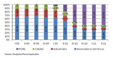 Así, en la figura 1, en el informe de la empresa calificadora de riesgos Apoyo & Asociados presentado en enero de 2012 denominado "Perú Informe Sectorial Hidrocarburos" se observa que el gas natural se destina a los rubros de exportación, electrificación, sector industrial y a usuarios comerciales e industriales.