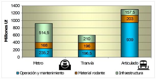 En la figura 3 se muestra el análisis de los costos de diferentes sistemas de transporte a un plazo de 30 años en función de los costos de infraestructuras viarias, de la compra y renovación del material rodante, y de la operación y mantenimiento.