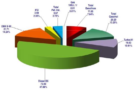El sector transporte es el mayor consumidor de combustibles líquidos en el Perú, siendo el principal producto demandado el Diesel B5, un combustible constituido por una mezcla de Diesel N°2 y 5% en volumen de Biodiesel B100, figura 3. En el informe de septiembre de 2011 sobre la Demanda Nacional de Combustibles de la Gerencia de Fiscalización de Hidrocarburos se indica que el consumo de combustibles líquidos alcanzó los 152440 barriles diarios. El 48% corresponde al Diesel B5 mientras que un 14% al Diesel B5 S50, un combustible constituido por una mezcla de Diesel B2 S50 y un 5% en volumen de Biodiesel B100 con muy bajo contenido de azufre y uso obligatorio en el sector automotriz de la Provincia de Lima y la Provincia Constitucional del Callao.