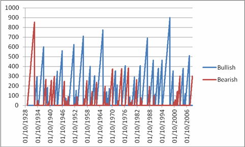 Como se puede apreciar, periodos de 300 a 600 días consecutivos de rentabilidades negativas o positivas no son infrecuentes con algunos picos de hasta 900 días.