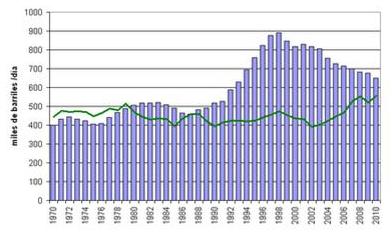 Figura 2: Evolución del saldo comercial de crudo en Argentina en el periodo de 1995 - 2011
