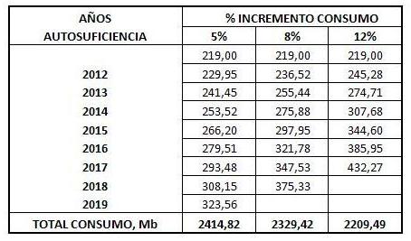 Tabla 1: Años de autosuficiencia en función del porcentaje de incremento del consumo interno