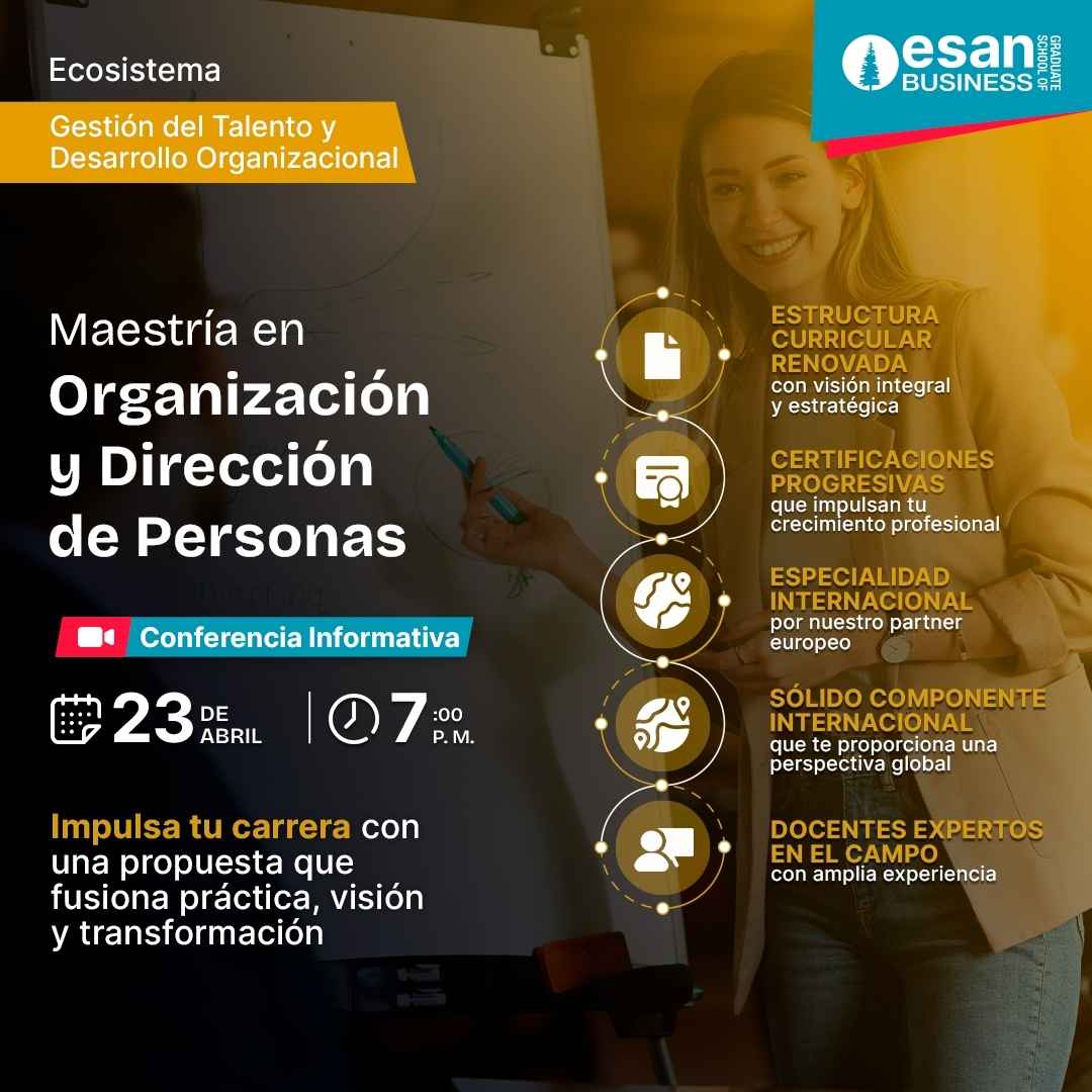 Impulsa tu desarrollo profesional con la Maestría Especializada en Organización y Dirección de Personas de ESAN. Únete a nuestra conferencia para conocer todos los aspectos que harán la diferencia en tu carrera.
